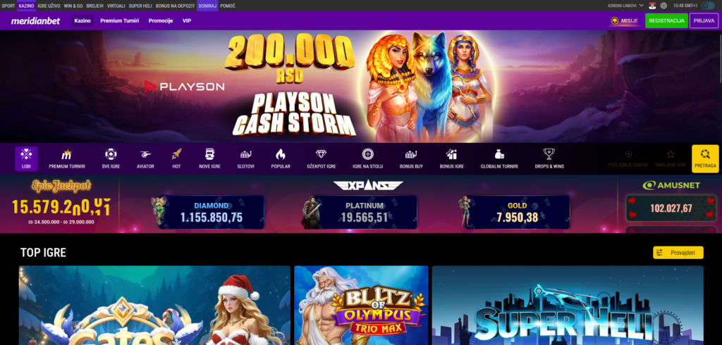 Meridianbet Casino nudi kompletnu gaming zonu sa velikim izborom slotova i live stolova, uz brzu navigaciju kroz igre i promocije.