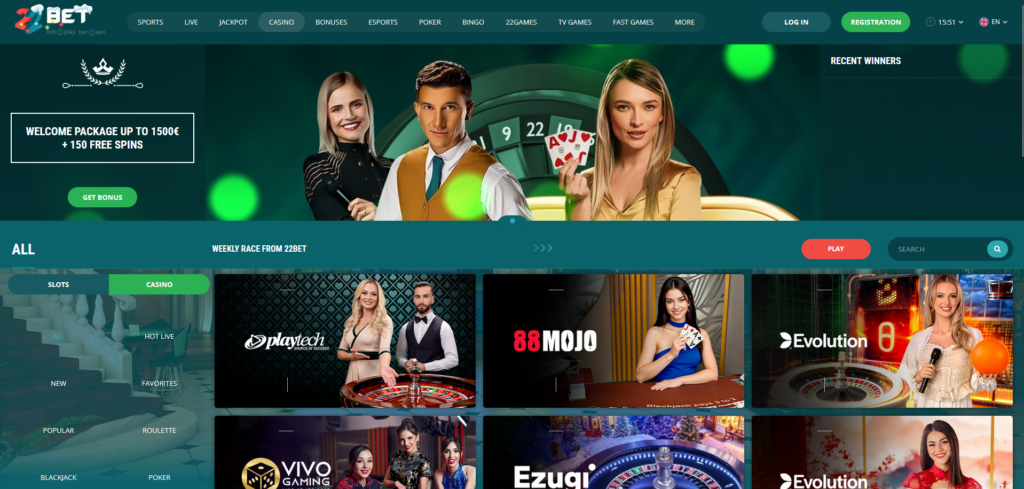 22Bet Casino je fokusiran na širinu ponude, sa hiljadama slotova i jakim live segmentom.