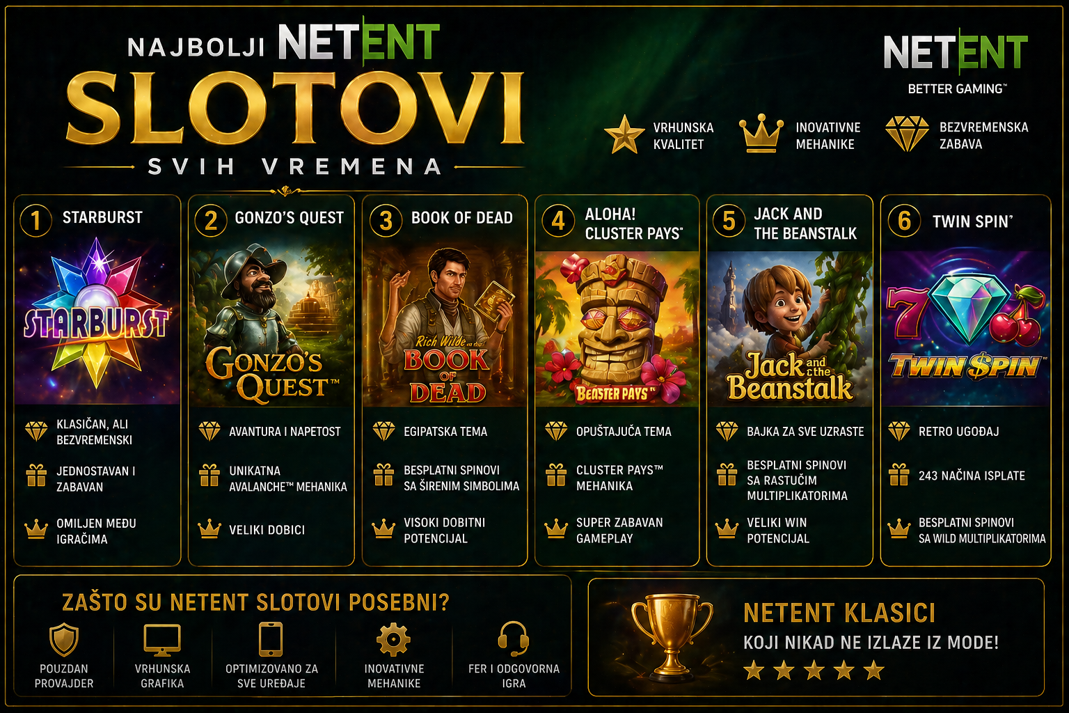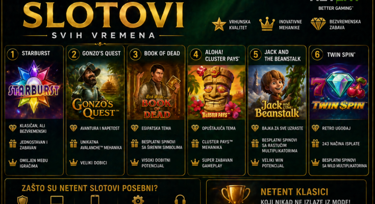 Najbolji NetEnt slotovi svih vremena nisu najbolji iz istog razloga. Starburst je legenda zbog jednostavnosti. Gonzo’s Quest je važan zbog inovacije. Dead or Alive 2 je kultni naslov zbog ekstremnog potencijala. Mega Fortune je sinonim za jackpot snove. Blood Suckers je cenjen zbog visokog RTP-a, dok Twin Spin, Jack and the Beanstalk i Divine Fortune pokrivaju različite stilove igre.